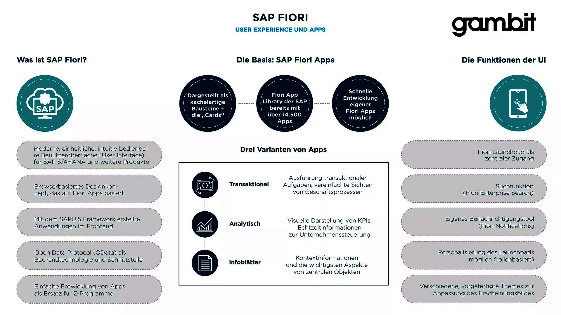 Auch GAMBIT unterstützt Unternehmen dabei, eigene HTML5-basierte Anwendungen für weitere individuelle Aufgaben zu erstellen. Dies ist auch sinnvoll und erforderlich, denn SAP wird selbst nicht alle rund 400.000 bisherigen Benutzeroberflächen (SAP-Dynpros) in Fiori nachprogrammieren.